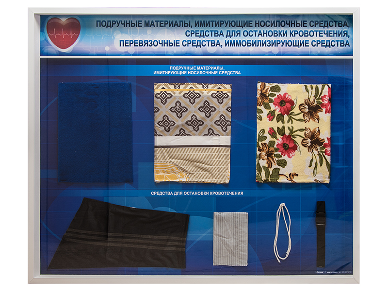 Стенды "Подручные материалы, имитирующие носилочные средства, средства для остановки кровотечения, перевязочные средства, иммобилизирующие средства" (образцы под оргстеклом)