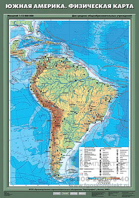 Масштаб 1:12000000, формат 70*100 см. На карте изображены гидрография и рельеф Южной Америки, морские течения, месторождения полезных ископаемых. Односторонняя печать, двустороннее ламинирование, лицевая сторона покрыта матовым ламинатом.
