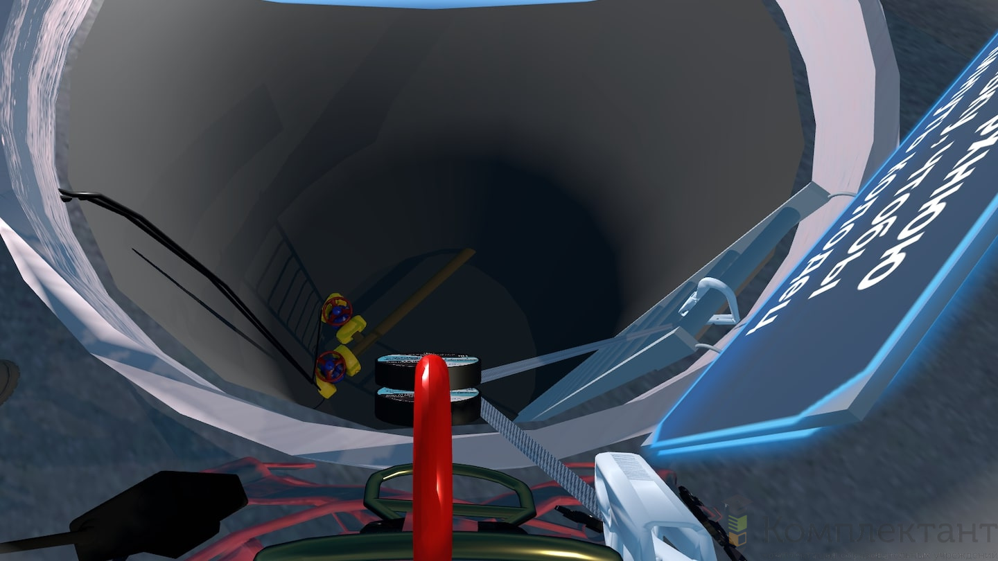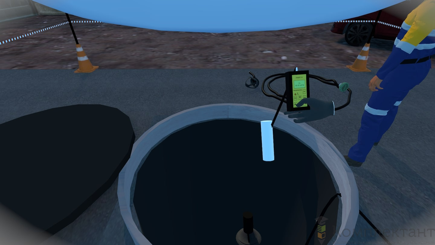 Виртуальный (VR) тренажер «Газоопасные работы» воссоздает ситуацию, в которой пользователь попадает в колодец глубиной 4 метра, где ему необходимо провести осмотр трубы, используя газоанализатор и противогаз, в условиях недостатка кислорода и наличия взрывопожароопасных загрязнителей в воздухе. В симуляции можно задать дополнительное условие: допуск с неполным комплектом.