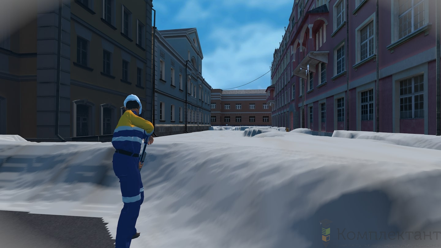 Виртуальный (VR) тренажер «Безопасность по дороге на работу» воссоздает ситуацию, в которой пользователю после аномального снегопада предстоит добраться от машины, припаркованной во дворе, до входа в офис на противоположном конце двора. На его пути будут возникать различного рода препятствия (открытые люки, сосульки на крышах, сброс снега с крыши и др.), которые пользователю необходимо преодолеть.