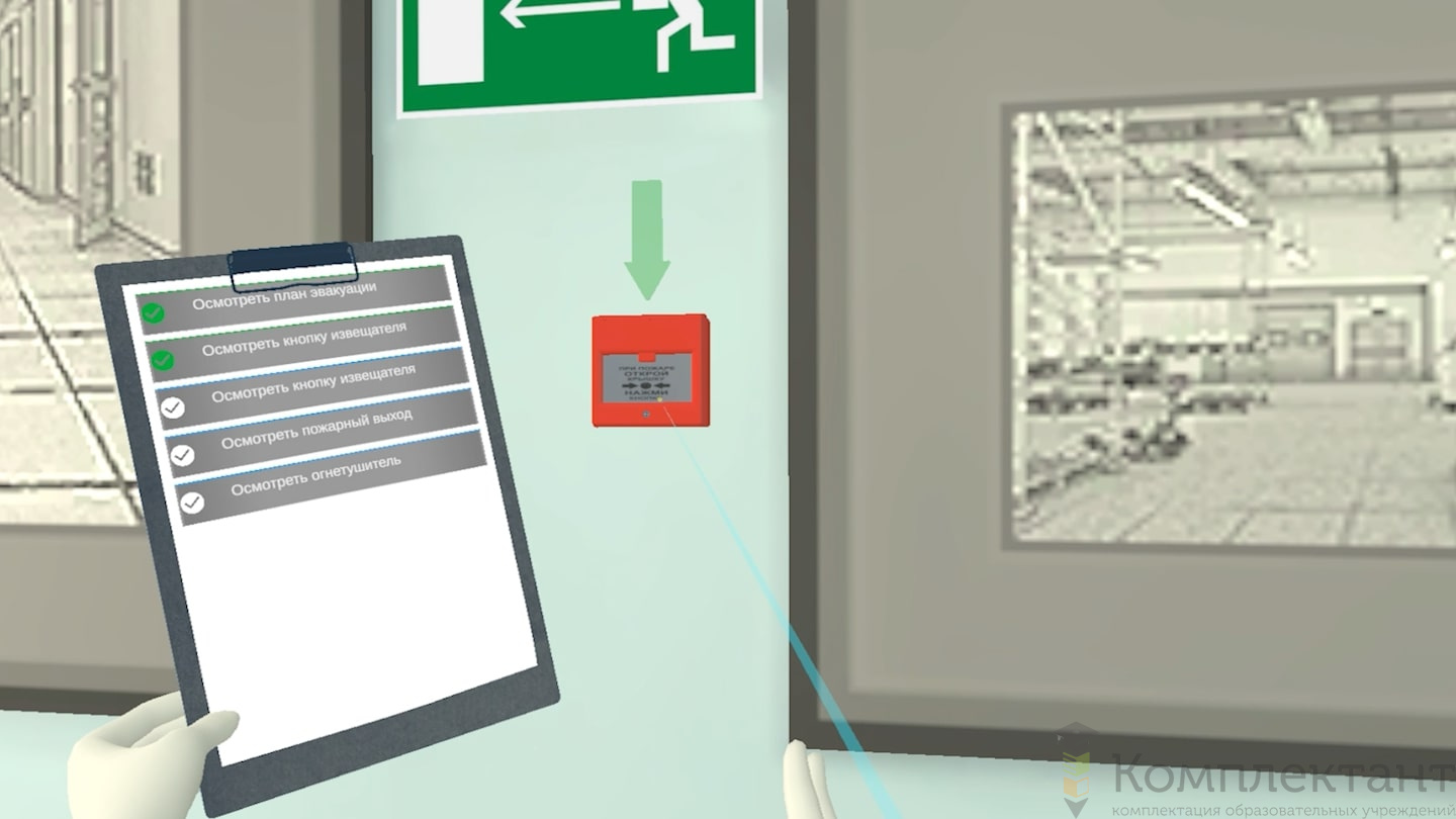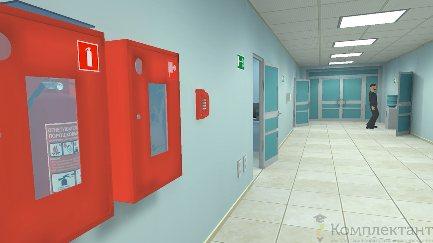 Виртуальный (VR) тренажер «Пожарная безопасность в офисе» моделирует чрезвычайную ситуацию, связанную с возгоранием в офисном помещении. В ходе тренировки пользователь должен оперативно прекратить рабочий процесс, сообщить о происшествии в экстренные службы, организовать эвакуацию в соответствии с утвержденной схемой, а также воспользоваться первичными средствами пожаротушения.